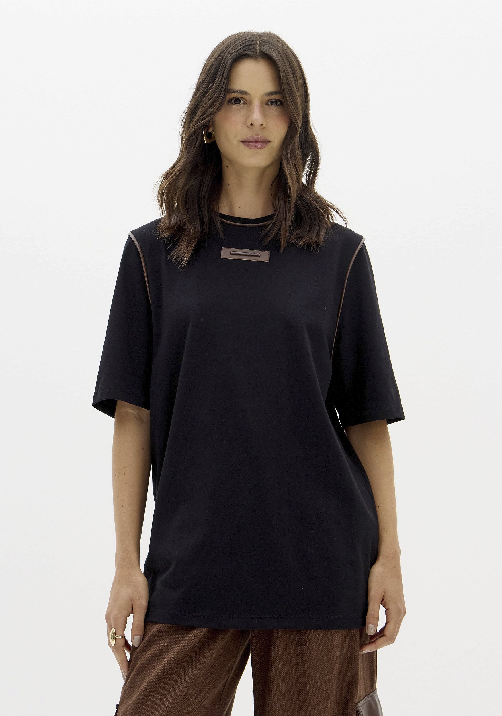 T-shirt oversized com design moderno e cheio de atitude. O destaque fica por conta do detalhe em viés de couro, que traz um toque sofisticado e urbano à peça. Confeccionada em tecido confortável, une estilo e versatilidade para o dia a dia.